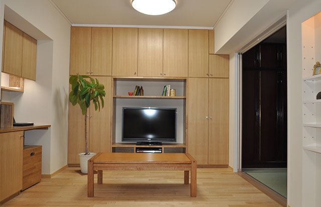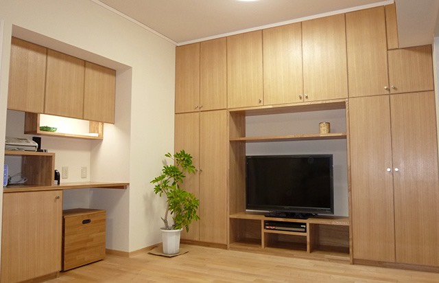オリジナルの壁面収納でピッタリ、スッキリ! マンションの限られたスペースを有効利用。