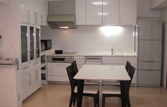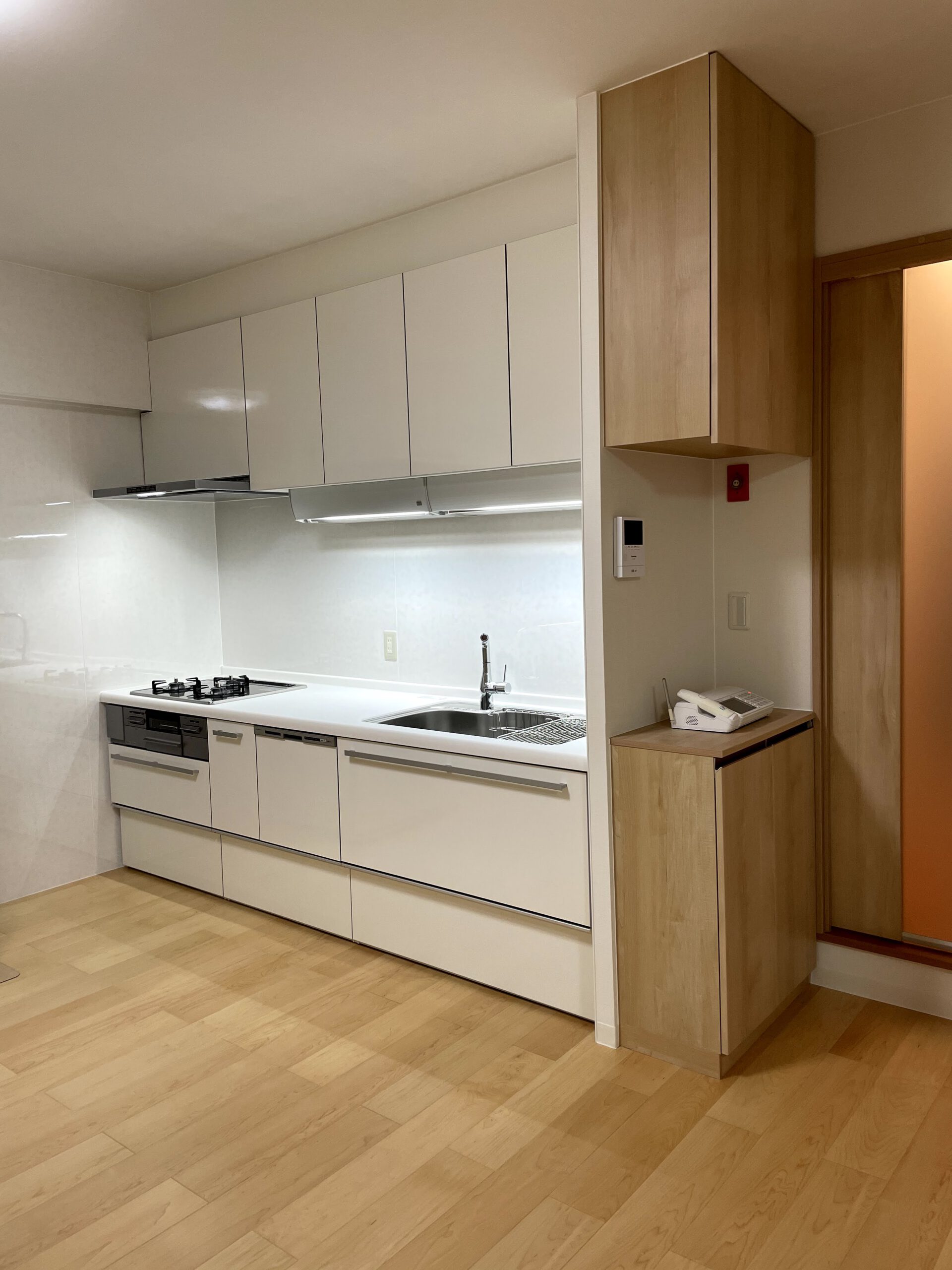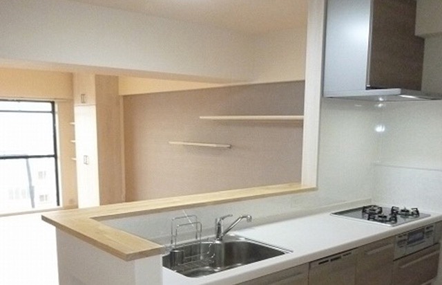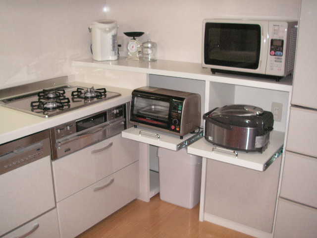 よくあるキッチンのカウンターですが下部を 収納庫に。壁面へ続くL型収納で広々スッキリ。