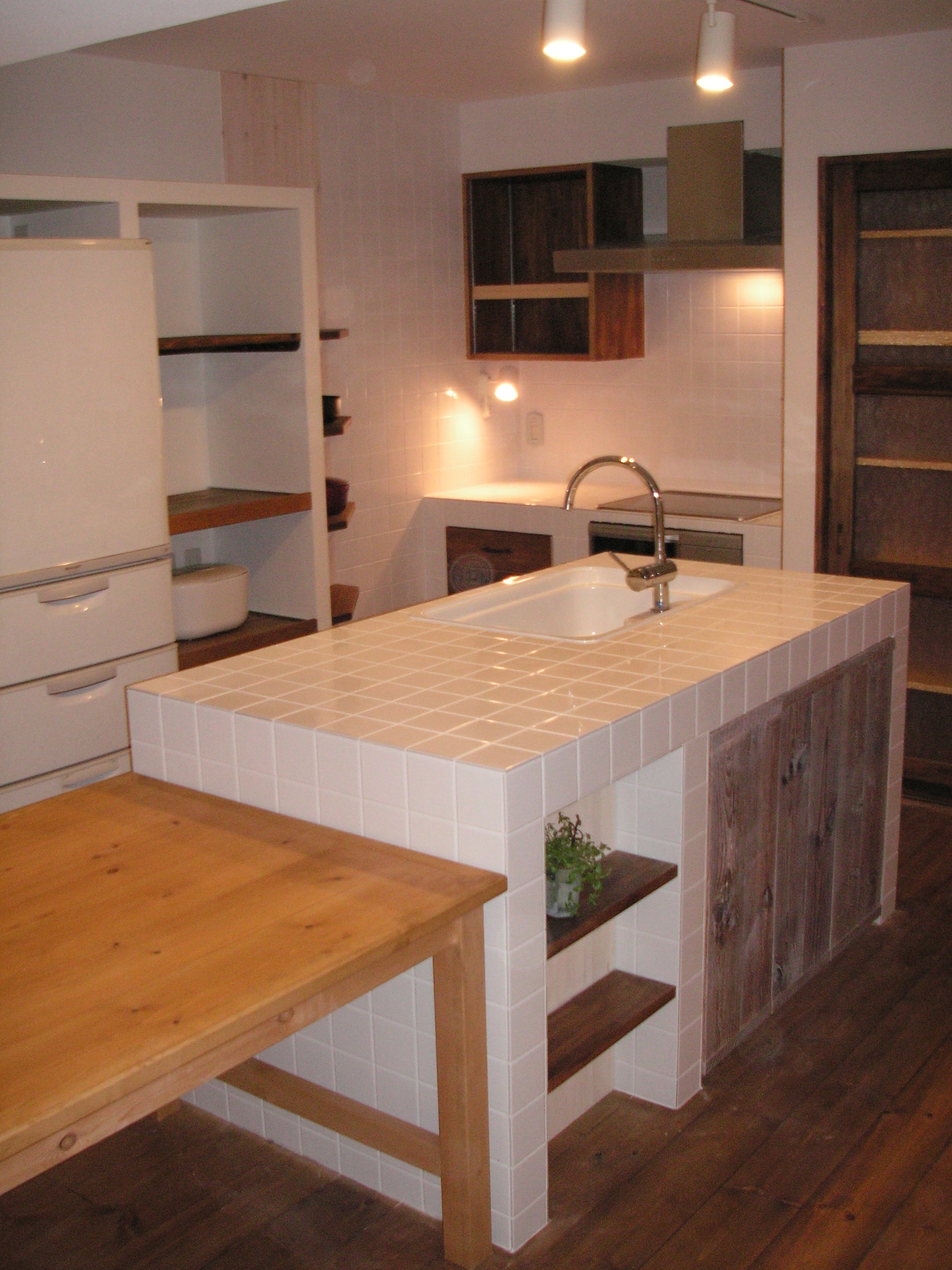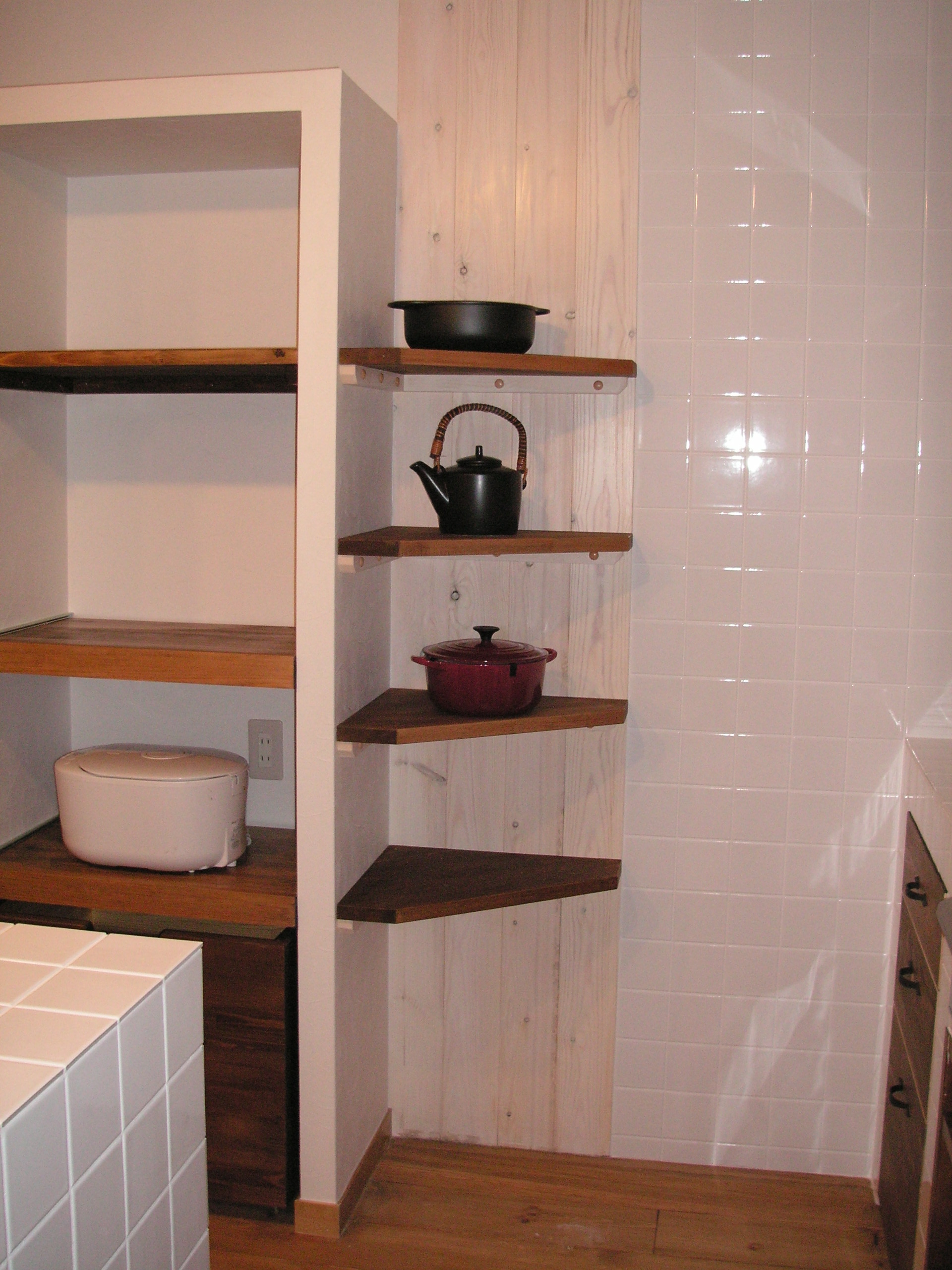 狭小スペースの機能的なオリジルキッチン。 塗壁、パイン材のフローロング、 タイルの素材感が大人かわいい小物とマッチ。