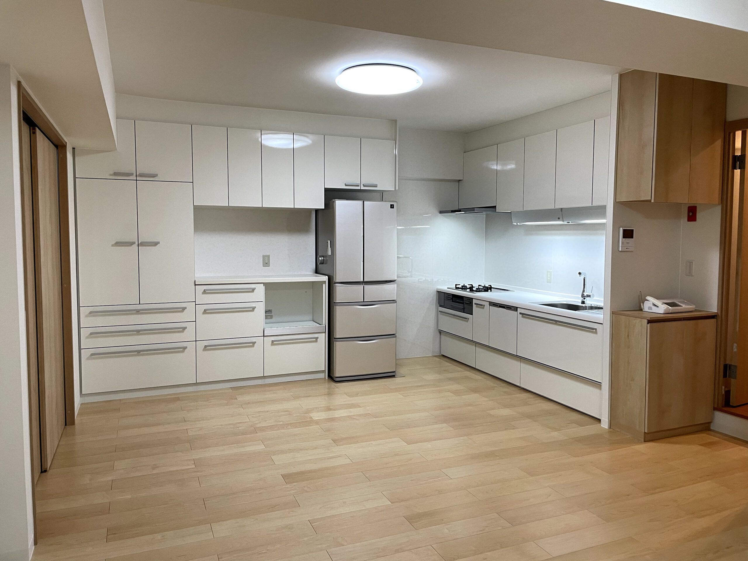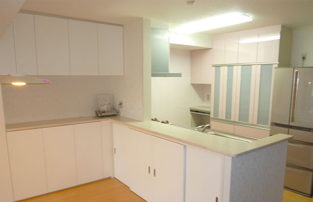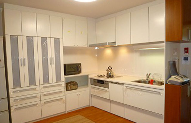 キッチンからL字に続くカウンターの壁面収納がすっきり素敵な全面リフォーム。